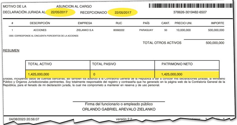 Para el 20 de julio de 2023 su monto “cash” trepó a G. 1.500 millones, en tanto, que en depósitos declaró un poco más de G. 87 millones.