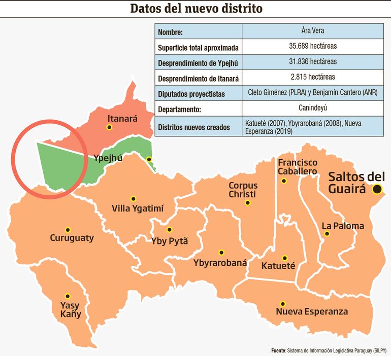 Según el proyecto presentado el pasado 9 de setiembre a la Cámara de Diputados y que se encuentra en la Comisión de Asuntos Municipales y Departamentales, la superficie total del nuevo distrito será solo de treinta y cinco mil seiscientos ochenta y nueve hectáreas, cuatro mil cuatro metros cuadrados y doscientos treinta y dos centímetros cuadrados (35.689 ha 4004 m² 0232 cm²) y estará conformado por el 37% del territorio del municipio de Ypejhú al cual despojarán de 31.836 hectáreas y además del 27% de su presupuesto municipal, unos G. 1.285 millones y el 3% del municipio de Itanará que perderá 2.815 hectáreas y el 3% de su presupuesto que llega a unos G. 130.146.270.