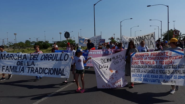 Ayer un grupo de ciudadanos autodenominados “Provida” y “Profamilia” realizó una marcha en la Costanera de Asunción para exigir al Senado y el presidente Santiago Peña dar trámite a la derogación.
