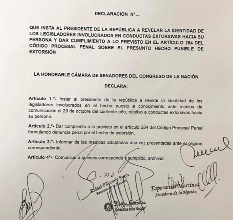 La iniciativa insta al Presidente de la República, Santiago Peña, a revelar la identidad de los legisladores involucrados en el hecho que él m ismo puso a conocimiento público ante algunos medios de comunicación el 29 de octubre, relativo a presuntas conductas extorsivas hacia su persona.