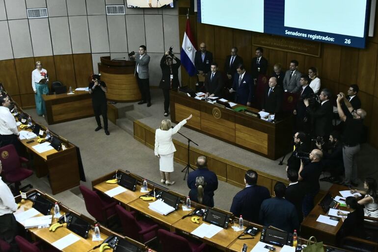 En el momento en que la exministra de la Corte Suprema de Justicia ingresó al recinto, los opositores gritaron “violación”, lo que generó la reacción del líder de la bancada cartista Basilio “Bachi” Núñez, quien se levantó de su asiento para empujar al senador del Partido Liberal Radical Auténtico, Eduardo Nakayama hasta llevarlo afuera.
