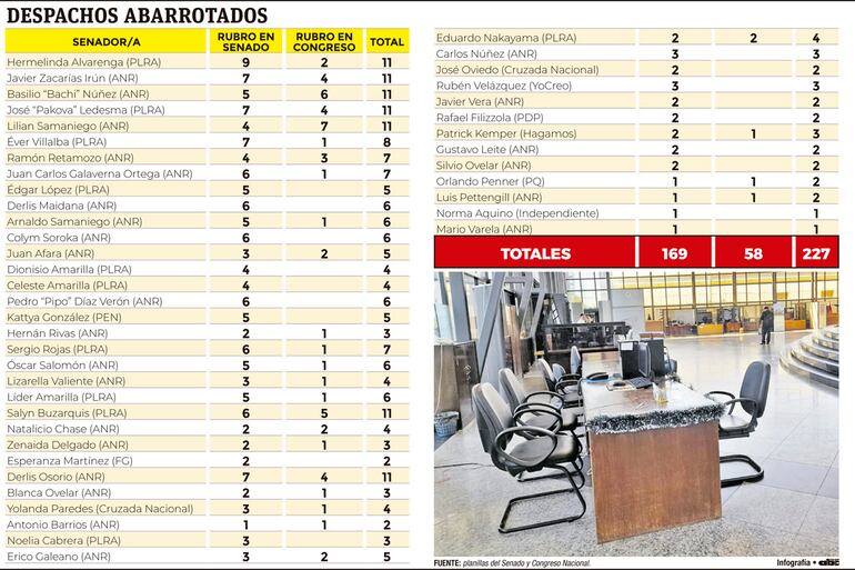 Los senadores con la mayor cantidad de funcionarios en sus respectivas oficinas, según las planillas, son los colorados Basilio “Bachi” Núñez, Derlis Osorio, Lilian Samaniego y Javier Zacarías Irún, además de los liberales José “Pakova” Ledesma, Enrique Salyn Buzarquis y Hermelinda Alvarenga.