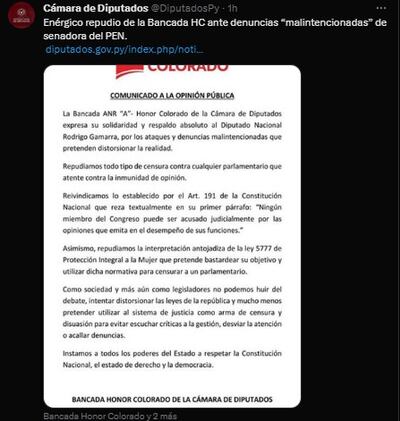 “Enérgico repudio de la Bancada de HC ante denuncias ‘malintencionadas’ de senadora del PEN”, indicaba el posteo de la cuenta oficial de Diputados en la red social X (ex-Twitter).