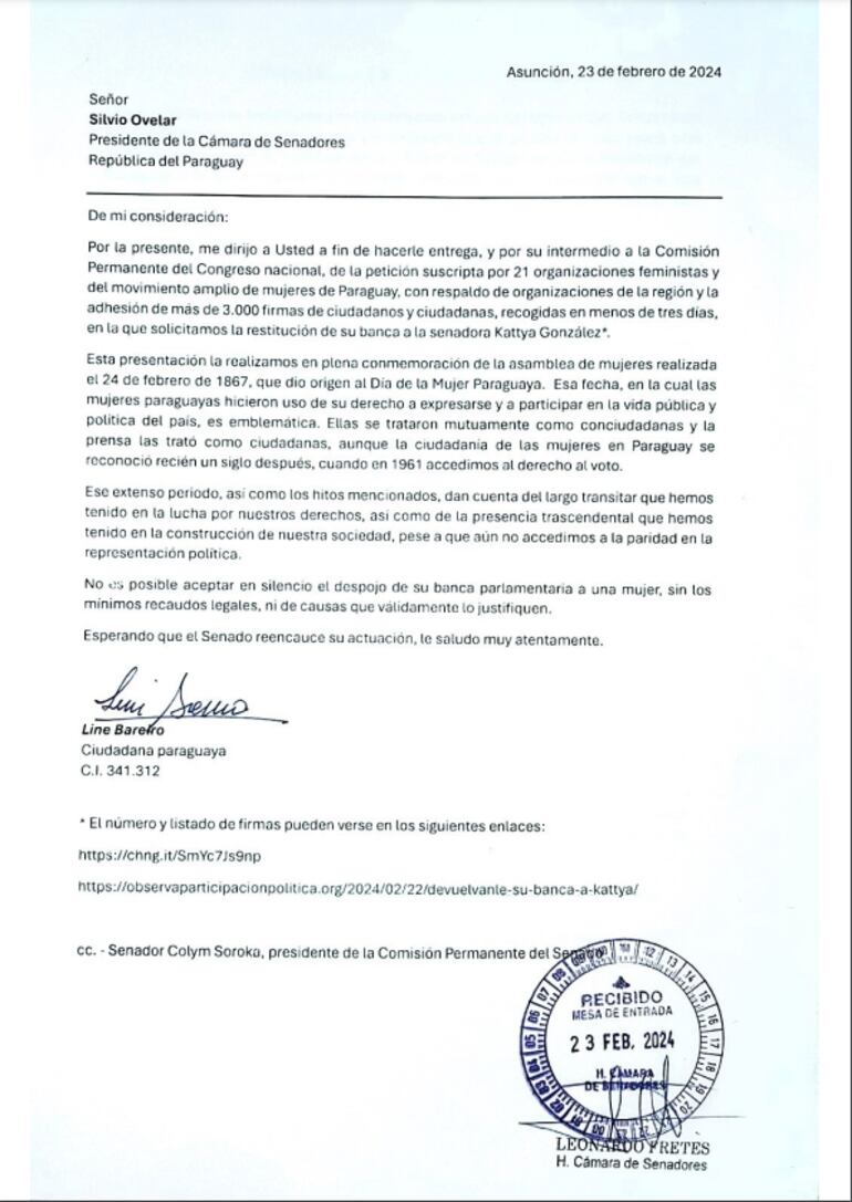 Resaltan que fueron pocas las veces en que organizaciones sociales, gremios empresariales, organizaciones estudiantiles, concejales municipales, la prensa y la Iglesia Católica expresaron el repudio ante el agravio al Estado de derecho y el retroceso de la democracia en Paraguay y manifiestan que la expulsión de Kattya es un golpe a la representación de las mujeres.