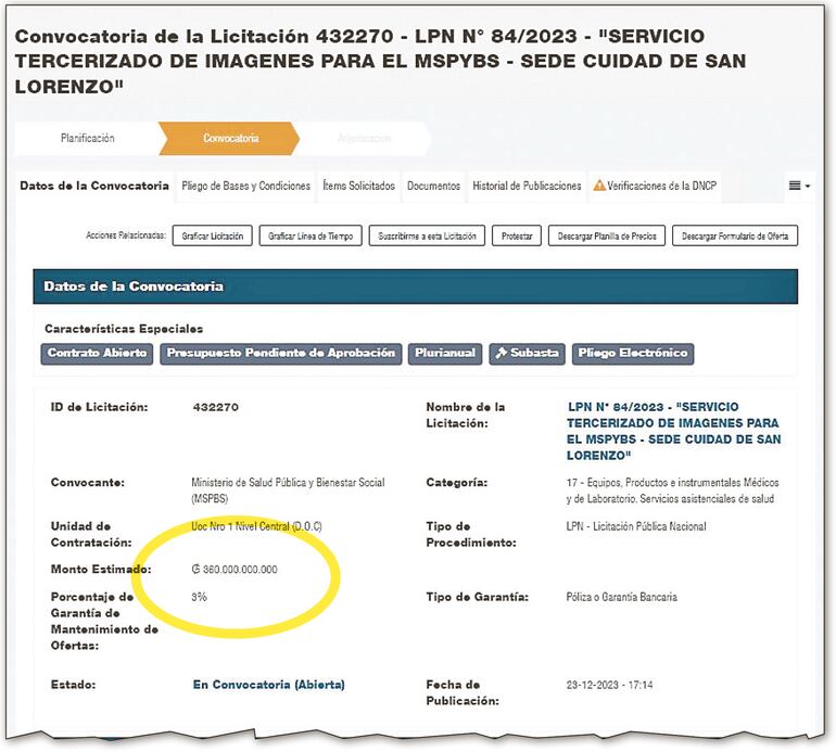 Los registros de la Dirección Nacional de Contrataciones Públicas (DNCP) detallan que el llamado a licitación para la tercerización del servicio de imágenes del Ministerio de Salud Pública tuvo cuatro versiones de Pliego de Bases y Condiciones (PBC). El primero, del 23 de diciembre de 2023, el segundo del 27 de diciembre del año pasado, el tercero del 28 de diciembre de 2023 y el cuarto del 18 de enero del presente año.