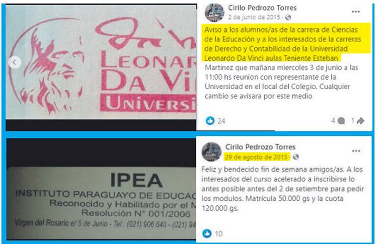 En el informe de la fiscala Sánchez, se le presenta al profesor jubilado y concejal de Teniente Esteban Martínez, Cirilo Pedrozo Torres (PLRA), como uno de los excompañeros de Arévalo. Lo cierto es que Pedrozo Torres no aparece en los registros del Ministerio de Educación y Ciencias (MEC) ni de la Corte Suprema de Justicia (CSJ) como un egresado o estudiante de esa especialidad.