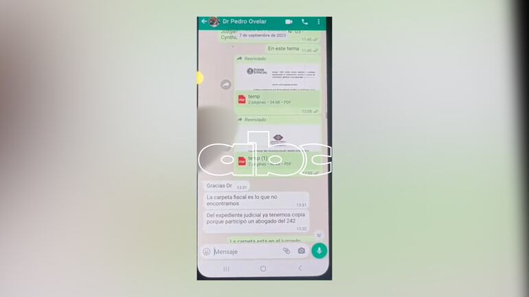 El fiscal le señala a Ovelar que supuestamente ya “tiene todo” y hablan de un hombre identificado como Eric César Rojas, en un caso de estafa y le manda documentos. El abogado le habría agradecido y dice que la carpeta fiscal es la que no encontraron y el expediente lo consiguieron.