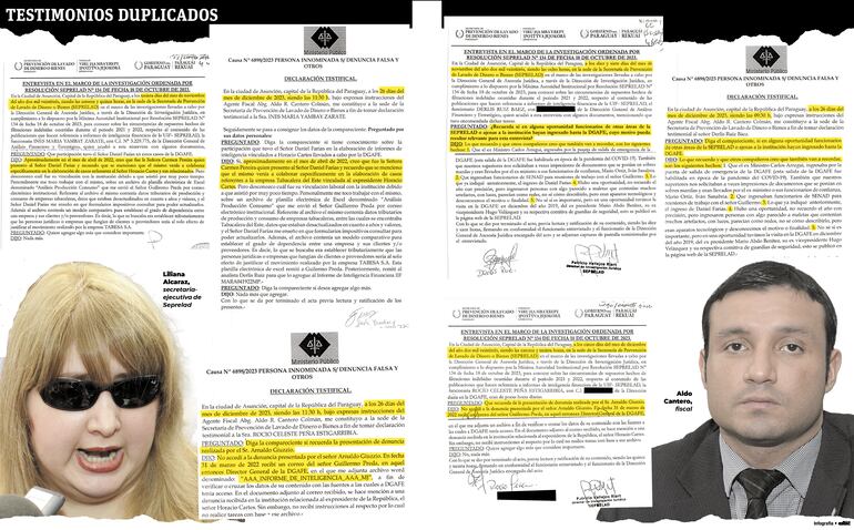 El famoso “copiar y pegar” al parecer le aplicó la persona (no identificada ni mucho menos citada en los documentos) que acudió en representación del fiscal Aldo Cantero para tomar las declaraciones testificales a los tres funcionarios de la Secretaría de Prevención del Lavado de Dinero o Bienes (Seprelad), cuya actual titular es la exfiscala anticorrupción Liliana Alcaraz. Y es que los testimonios de los empleados: Derlis Ruiz, Inés Yambay y Rocío Peña son idénticos desde la forma hasta los errores ortográficos a los recogidos por el director de Investigación Jurídica de la entidad antilavado de nuestro país, Patricio Vallejos.