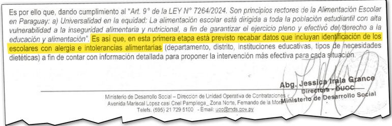 “Es por ello que, dando cumplimiento al ‘Art. 9 de la Ley N° 7264/2024 (Que crea el Fondo Nacional de Alimentación Escolar). Son principios rectores de la Alimentación Escolar en Paraguay: a) Universalidad en la equidad: La alimentación escolar está dirigida a toda la población estudiantil con alta vulnerabilidad a la inseguridad alimentaria y nutricional, a fin de garantizar el ejercicio pleno y efectivo del derecho a la educación y alimentación.