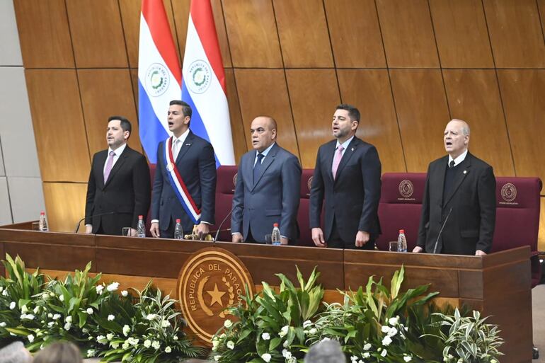 El presidente de la República de Paraguay, Santiago Peña, llegó a la Cámara Bicameral del Congreso Nacional para brindar su primer informe de gestión. El nuevo presidente de la Cámara de Senadores, Basilio “Bachi” Núñez, presidió la sesión del Congreso para recibir el informe presidencial.