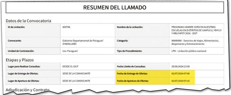 El llamado a licitación de la Gobernación de Paraguarí es uno de los que tuvo observaciones de la Dirección Nacional de Contrataciones (DNCP), atendiendo que los requisitos establecidos inicialmente en el Pliego de Bases y Condiciones (PBC) podrían resultar limitantes o excluyentes para empresas. Uno de ellos era que los interesados en participar debían demostrar provisión de lo ofertado por un monto equivalente al 50% como mínimo del monto total ofertado.