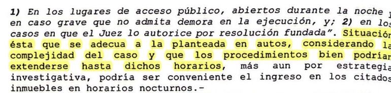 En el primer punto explicó que el Código Procesal Penal (CCP) establece que los registros y allanamientos solo podrán realizarse entre las 06:00 y las 18:00 (art. 186) y que solo en casos excepcionales se realizan en horario nocturno, en los que el juez que los autorice debe señalar los fundamentos en la resolución. “Este requisito no se cumplió, alegar “complejidad” no es motivar o justificar la decisión”, cuestionó el legislador.