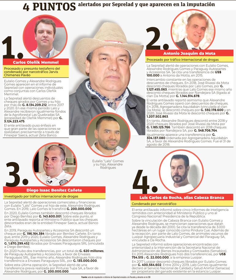 Un comparativo entre el acta de imputación presentada el 19 de agosto pasado por los fiscales Osmar Segovia, Ingrid Cubilla y Elva Cáceres y el informe de inteligencia financiera elaborado el 8 de noviembre de 2021 por la Secretaría de Prevención de Lavado de Dinero (Seprelad), durante la gestión de Carlos Arregui, revela que varias de las alertas eran ciertas para la apertura de un proceso por los supuestos hechos punibles de asociación criminal y lavado de dinero proveniente del tráfico internacional de drogas contra el fallecido diputado cartista Eulalio “Lalo” Gomes y su hijo Alexandre Rodrigues Gomes. La entidad antilavado, precisamente, estableció como hipótesis que tanto el legislador colorado como su hijo habrían montado una red dedicada a la captación, colocación, estratificación y reintegro de dinero asociado a actividades criminales relacionadas con altos referentes del narcotráfico en frontera.