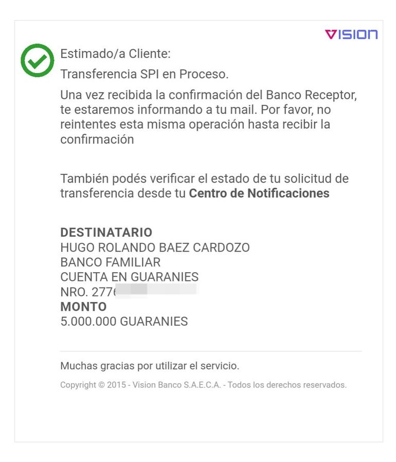 En una captura compartida por el intendente, se verifica una transferencia bancaria realizada a una cuenta bancaria en una conocida entidad bancaria a nombre de Hugo Rolando Báez Cardozo por valor de G. 5.000.000.