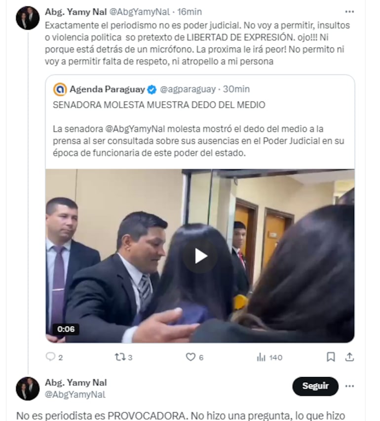 “El periodismo no es poder judicial. No voy a permitir, insultos o violencia política so pretexto de LIBERTAD DE EXPRESIÓN. Ojo!!! Ni porque está detrás de un micrófono. La próxima le irá peor! No permito ni voy a permitir falta de respeto, ni atropello a mi persona (sic)”, declaró la senadora cartista.