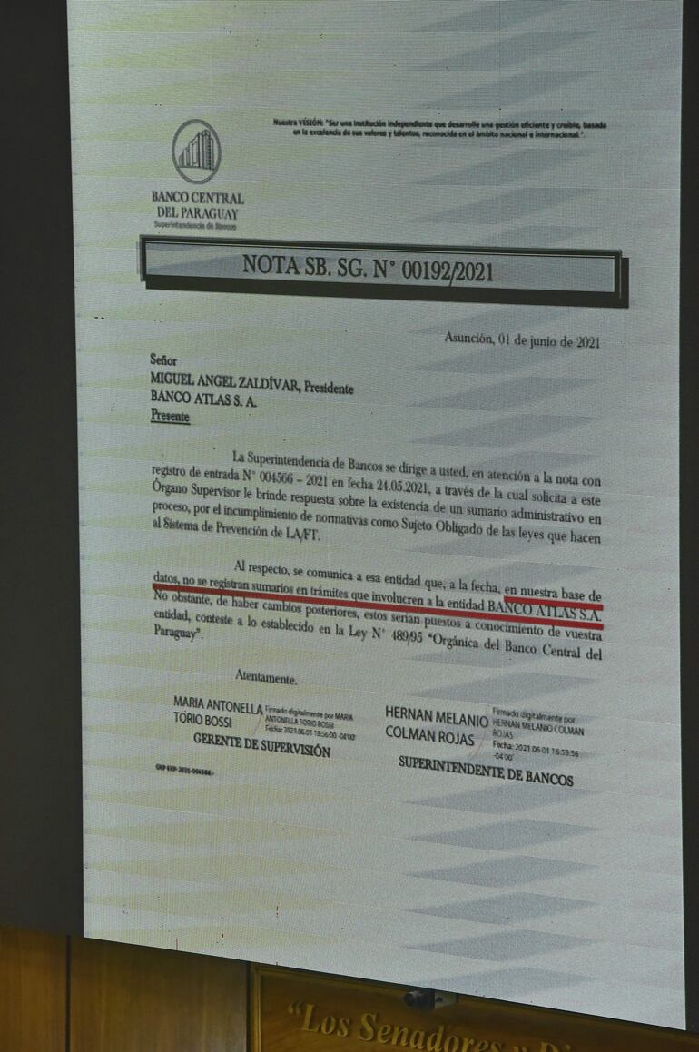 “Cuando empezaron a salir algunas publicaciones, nosotros por secreto bancario no podemos exponer a la opinión pública los documentos que tenemos. Entonces en ese momento mandamos una nota al BCP diciendo: Infórmennos si nosotros fuimos alguna vez sancionados, si tenemos algún caso abierto por incumplimiento de los procesos de prevención de lavado de dinero y el Banco Central nos responde con esta nota, donde dice claramente que en sus registros no hay ningún antecedente”, dijo el director de Atlas, mientras proyectaba el documento.
