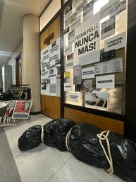 Atendiendo a que se acerca la fecha de nacimiento del nefasto dictador colorado Alfredo Stroessner y con el fin de no olvidar la serie de crímenes que este cometió, el “cuerpo” tendido en el pasillo es un recordatorio de la serie de asesinatos y desapariciones que perpetró el régimen, que no solo dejó eso como nefasta herencia, sino sobre todo un esquema de corrupción y prácticas que tienden a repetirse. Por ello, Benítez dijo enfáticamente: “Fecha feliz nunca más”.