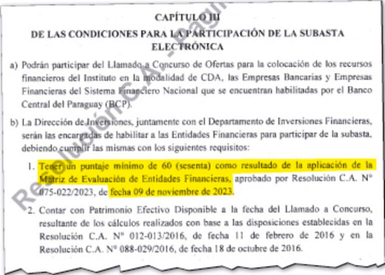 El 9 de noviembre de 2023, escasos dos meses después de la llegada de Jorge Brítez a la presidencia del Instituto de Previsión Social (IPS), el Consejo de Administración de ese organismo aprobó la “matriz de evaluación de entidades financieras” para la participación en los concursos de ofertas de colocación de Certificados de Depósito de Ahorro (CDA) a través del sistema Datatec. Con esta disposición también se dejaba sin efecto una resolución de 2015 y sus respectivas modificaciones.