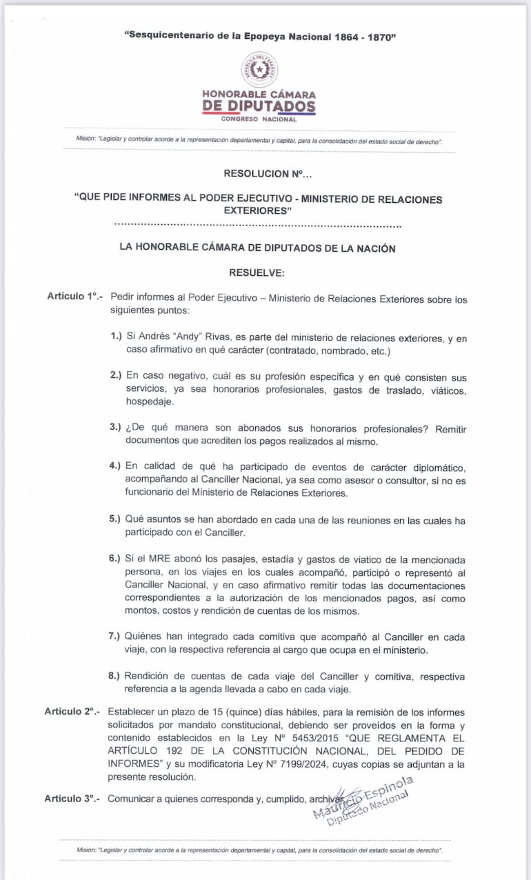 “El objetivo de esta solicitud de informe es obtener claridad y transparencia sobre la participación de Andrés “Andy” Rivas en eventos de carácter diplomático y su relación con el Ministerio de Relaciones Exteriores, con el fin de garantizar la rendición de cuentas y la transparencia en la gestión pública. Además, se busca obtener información sobre la rendición de cuentas tanto de montos como de la agenda del canciller y comitiva en sus diferentes viajes. Esperamos que se considere nuestra solicitud y se nos proporcione la información requerida”, acotó Espínola.