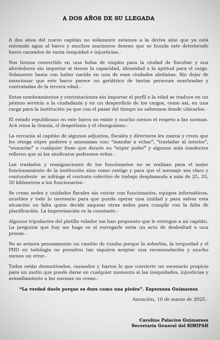 La secretaria general del Sindicato del Ministerio Público de la República del Paraguay (Simipar), Carolina Palacios Guimaraes, emitió un comunicado este lunes, fecha en que Emiliano Rolón cumple dos años como fiscal general del Estado.