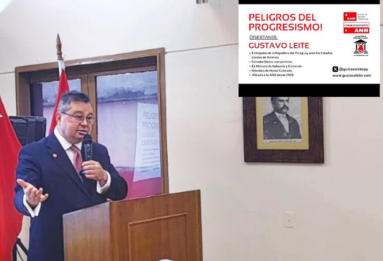 El senador con permiso, que ya juró como embajador, Gustavo Leite, con su sola participación esta mañana de la “Conferencia Magistral” sobre “peligros del progresismo”, una actividad partidaria realizada en la sede de la Asociación Nacional Republicana (ANR), y luego con sus declaraciones, violó la Ley Nº 6935 “Del servicio diplomático y consular”, y además admitió que, si se lo pide Santiago Peña, abogará en EE.UU. por Horacio Cartes, el declarado por ese país como “significativamente corrupto”.