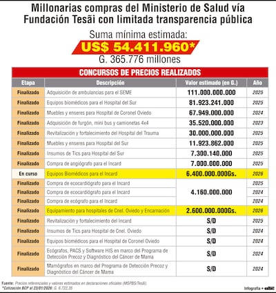 Los millonarios contratos gestionados por Tesãi para el Ministerio de Salud suman una inversión mínima estimada de G. 365.776 millones. Entre las adjudicaciones más destacadas figuran la compra de ambulancias para el SEME por G. 111.000 millones y equipos biomédicos para el Hospital del Sur por G. 81.923 millones, ambos procesos finalizados en 2025.