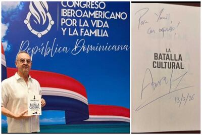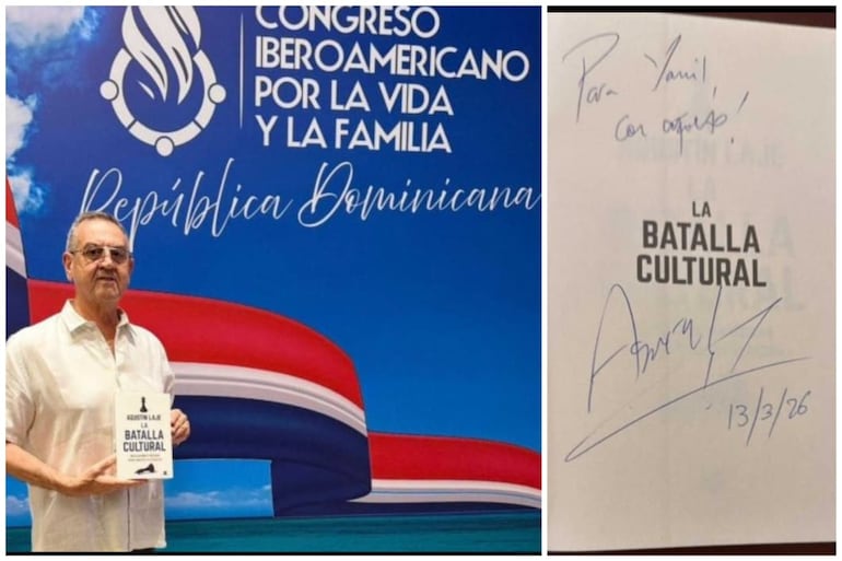 También como registro de su participación del encuentro religioso, Esgaib expuso fotos con un libro de Laje titulado “La batalla cultural”, autografiado y con dedicatoria del referente de ultraderecha.