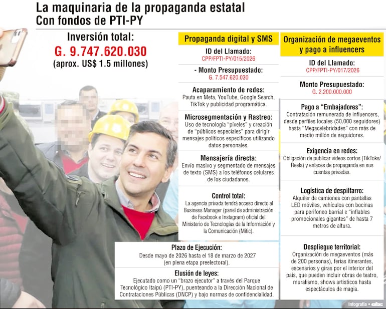 La administración de Santiago Peña, a través de la Fundación Parque Tecnológico Itaipú (PTI-PY), liderada por Carlos Mercado, apunta más de 9.747 millones de guaraníes (cerca de 1,5 millones de dólares) a repartirse en dos jugosos llamados a licitación destinados a un enorme despliegue de propaganda estatal.