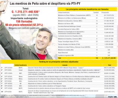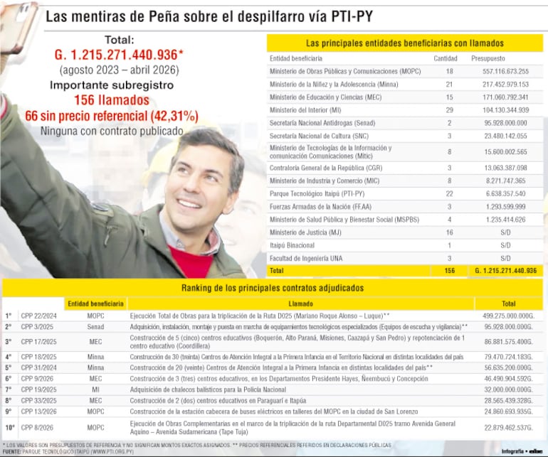 El presidente Santiago Peña afirmó recientemente que los recursos del Parque Tecnológico Itaipú (PTI-PY) están totalmente transparentados; sin embargo, la web de la fundación demuestra que el Gobierno ejecutó G. 1,2 billones en 156 licitaciones, eludiendo la ley de compras públicas y ocultando información clave.
