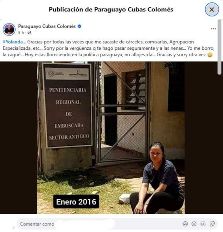 “Yolanda... Gracias por todas las veces que me sacaste de cárceles, comisarías, Agrupación Especializada, etc... Sorry por la vergüenza q te hago pasar seguramente y a las nenas... Yo me borro, la cagué...“ (sic), menciona el mensaje publicado a las 2:17 de la madrugada.