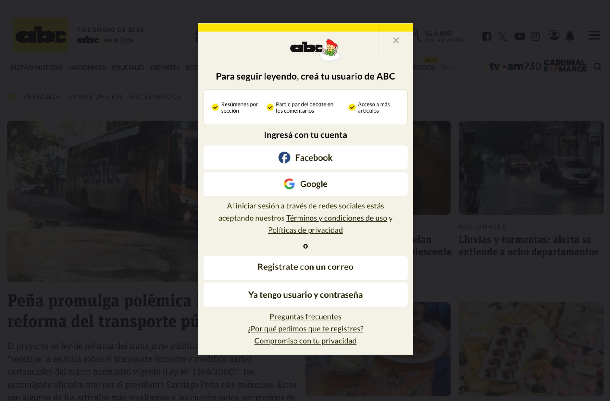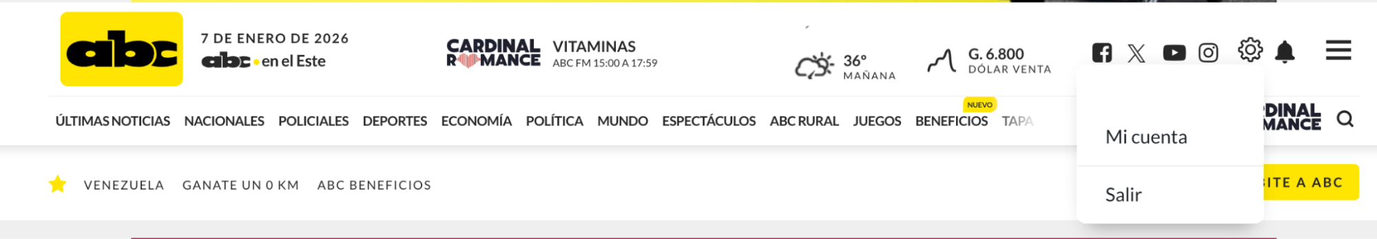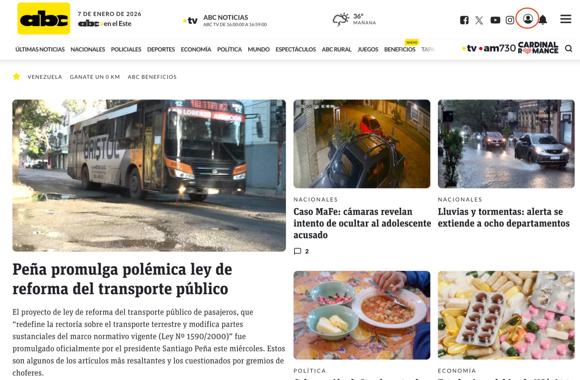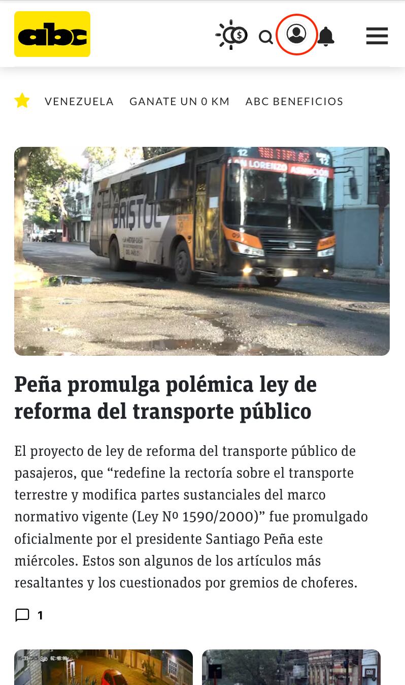 Desde un navegador web, ya sea desde su computadora o su celular debe ingresar a la página de ABC Color con el siguiente enlace https://www.abc.com.py/. En el menú superior, tocá el botón de ícono de usuario.