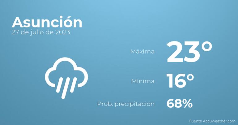 A lo largo de la mañana en Asunción se esperan cielos cubiertos con probabilidad de lloviznas generalizadas e intermitentes. Por la tarde habrá más nubes que claros con probabilidad de alguna llovizna. Con respecto a las temperaturas, estas oscilarán entre los 23 grados de máxima y 16 de mínima. Junto a todo esto, se esperan vientos de carácter débil con cifras de hasta 20 kilómetros por hora.