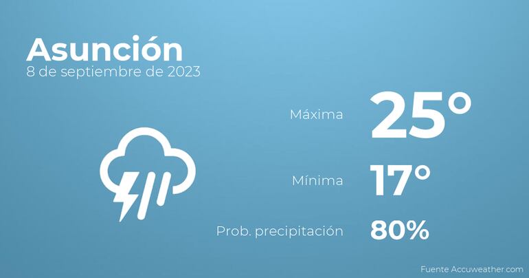 En las primeras horas del día en Asunción el cielo estará cubierto con tormentas acompañadas de lluvia. Por la tarde se esperan más nubes que claros con probabilidad de tormentas acompañadas de lluvia. En cuanto a las temperaturas, oscilarán entre una máxima de 25 y una mínima de 17 grados. Además, se esperan vientos sin apenas intensidad con cifras de hasta 37 Km/h.