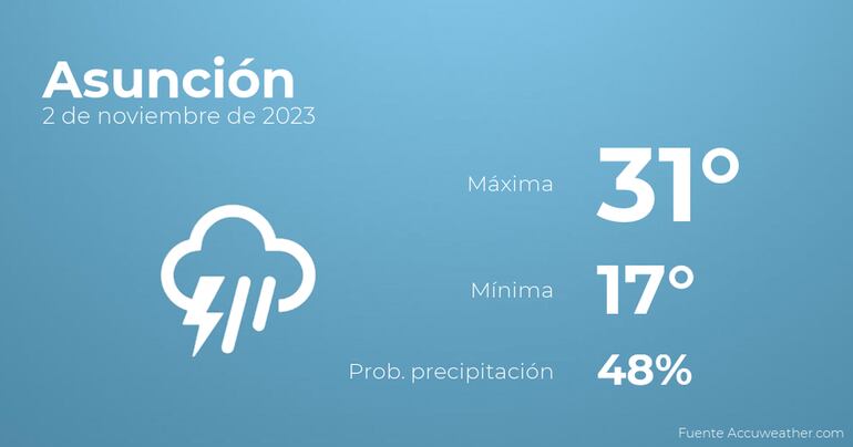 Durante la mañana en Asunción el cielo estará cubierto con probabilidad de tormentas y lluvia. Según pasen las horas el cielo estará cubierto con tormentas acompañadas de lluvia. Las temperaturas se moverán entre una máxima de 31 y una mínima de 17 grados centígrados. Viento sin apenas intensidad con cifras de hasta 43 kilómetros por hora.