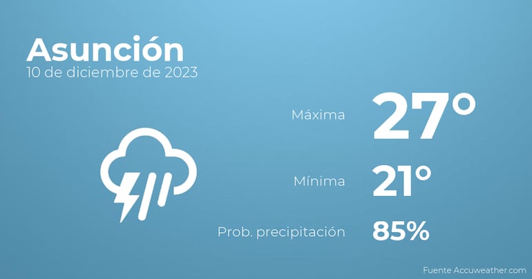Hoy a primera hora en Asunción el cielo estará cubierto con tormentas acompañadas de lluvia. Según pasen las horas se prevén cielos despejados. Por lo que respecta a las temperaturas, estas variarán entre los 27 grados de máxima y 21 de mínima. Viento del sureste de carácter flojo con valores de hasta 32 Km/h.