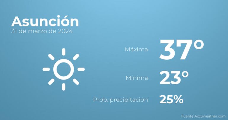 Hoy a primera hora en Asunción se esperan cielos despejados con baja probabilidad de que haya precipitaciones. Por la tarde tendremos nubes y claros con probabilidad de tormentas acompañadas de lluvia. Las temperaturas estarán entre una máxima de 37 y una mínima de 23 grados centígrados. Además, se esperan vientos de carácter flojo con rachas de hasta 35 Km/h.