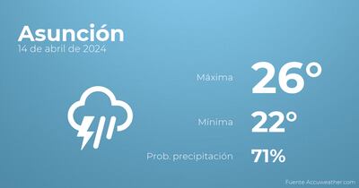 Hoy por la mañana en Asunción el cielo estará cubierto con probabilidad de tormentas y lluvia. Por la tarde habrá cielos cubiertos con alguna llovizna. En cuanto a las temperaturas, estas oscilarán entre los 26 grados de máxima y 22 de mínima. En general, vientos del noreste de carácter flojo con valores de hasta 33 Km/h.