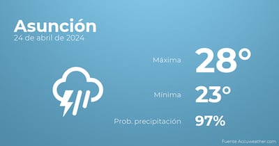 Para las primeras horas del día en Asunción habrá cielos cubiertos con tormentas acompañadas de lluvia. Según pasen las horas tendremos nubes y claros con escasa probabilidad de precipitaciones. En relación a las temperaturas, estas variarán entre los 28 grados de máxima y 23 de mínima. Viento del este de carácter débil con rachas de hasta 24 kilómetros por hora.
