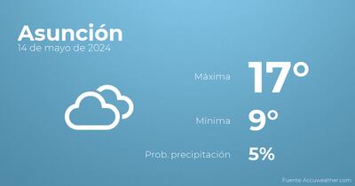 Para hoy por la mañana en Asunción el cielo estará cubierto. Según pasen las horas estará muy nublado. Con respecto a las temperaturas, estas se moverán entre una máxima de 17 y una mínima de 9 grados centígrados. Viento del sur de poca intensidad con valores de hasta 37 Km/h.