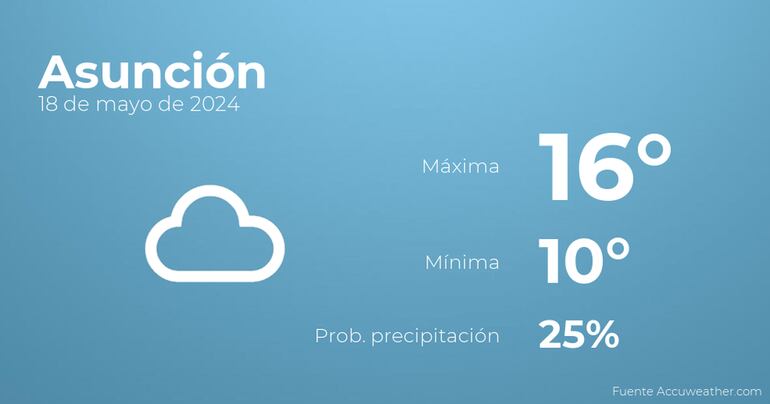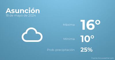 Durante las primeras horas del día en Asunción estará muy nublado con poca probabilidad de lluvias. Por la tarde se prevén cielos despejados. Con respecto a las temperaturas, estas se moverán entre una máxima de 16 y una mínima de 10 grados centígrados. Viento de carácter débil con valores de hasta 28 kilómetros por hora.