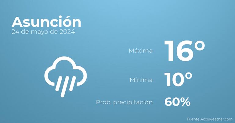 Para hoy por la mañana en Asunción se prevén cielos cubiertos con probabilidad de alguna llovizna. Por la tarde habrá nubes y claros. En cuanto a las temperaturas, variarán entre una máxima de 16 y una mínima de 10 grados centígrados. En general, vientos sin apenas intensidad con cifras de hasta 46 kilómetros por hora.