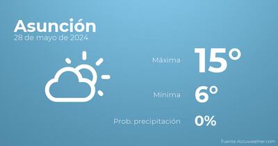 Para hoy por la mañana en Asunción tendremos nubes escasas. Por la tarde se prevén cielos despejados. Con respecto a las temperaturas, variarán entre una máxima de 15 y una mínima de 6 grados. Junto a todo esto, se esperan vientos del sur de carácter débil con rachas de hasta 24 kilómetros por hora.