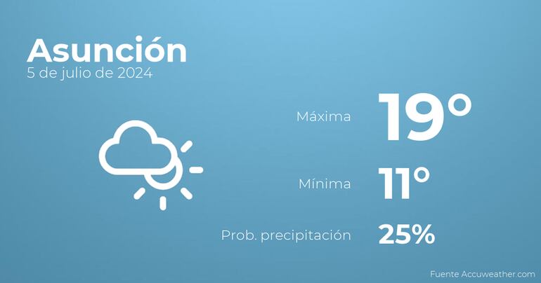 A lo largo de la mañana en Asunción se esperan más nubes que claros con poca probabilidad de precipitaciones. A medida que avance el día el cielo estará cubierto con probabilidad de lloviznas generalizadas. Las temperaturas oscilarán entre una máxima de 19 y una mínima de 11 grados centígrados. Además, se esperan vientos de carácter flojo con rachas de hasta 44 Km/h.