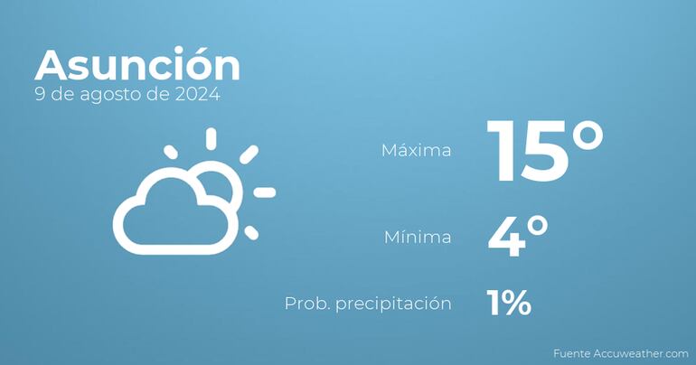 En las primeras horas del día en Asunción se espera escasa nubosidad. Según pasen las horas se prevén cielos sin nubes. Con respecto a las temperaturas, estas se moverán entre los 15 grados de máxima y 4 de mínima. Además, se esperan vientos sin apenas intensidad con cifras de hasta 37 Km/h.