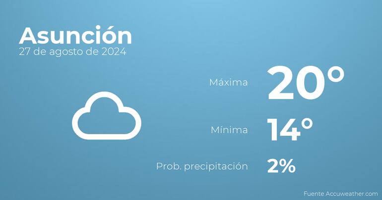 En la mañana de hoy en Asunción estará muy nublado. Según pasen las horas habrá más nubes que claros. Por lo que respecta a las temperaturas, estas variarán entre una máxima de 20 y una mínima de 14 grados centígrados. En general, vientos del sureste de carácter débil con cifras de hasta 26 kilómetros por hora.