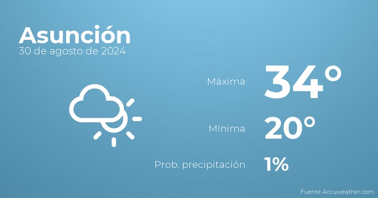 Hoy por la mañana en Asunción se prevén más nubes que claros. A medida que avance el día se esperan nubes y claros. En relación a las temperaturas, estas variarán entre una máxima de 34 y una mínima de 20 grados. Además, se esperan vientos de poca intensidad con rachas de hasta 30 Km/h.