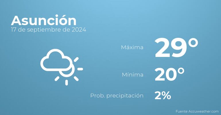 Durante las primeras horas del día en Asunción tendremos más nubes que claros. Según pasen las horas se esperan nubes y claros. En relación a las temperaturas, estas variarán entre una máxima de 29 y una mínima de 20 grados centígrados. En general, vientos del noreste sin apenas intensidad con rachas de hasta 33 Km/h.