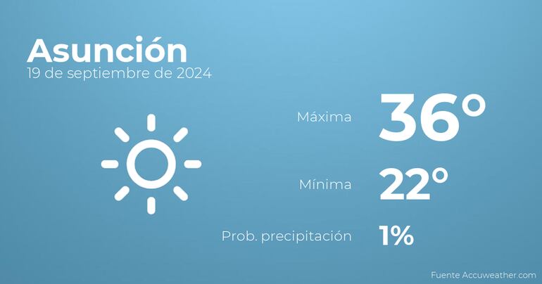 Durante las primeras horas del día en Asunción se esperan cielos sin nubes. Según pasen las horas tendremos más nubes que claros con tormentas y lluvia. Las temperaturas oscilarán entre una máxima de 36 y una mínima de 22 grados. Además, se esperan vientos de carácter débil con valores de hasta 39 kilómetros por hora.