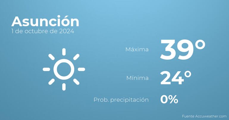 Para hoy por la mañana en Asunción tendremos cielos sin nubes. Por la tarde habrá más nubes que claros. Con respecto a las temperaturas, estas oscilarán entre los 39 grados de máxima y 24 de mínima. Además, se esperan vientos sin apenas intensidad con cifras de hasta 44 Km/h.