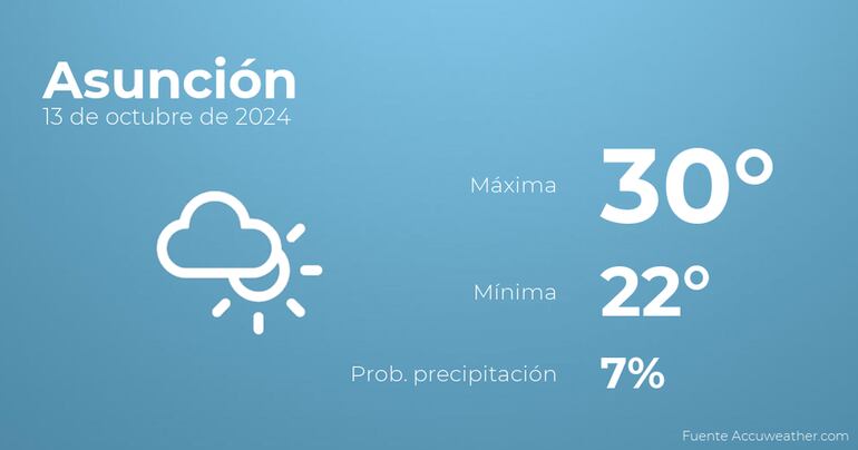 Durante las primeras horas del día en Asunción tendremos más nubes que claros. A medida que avance el día se prevén más nubes que claros con probabilidad de tormentas acompañadas de lluvia. Por lo que respecta a las temperaturas, estas variarán entre una máxima de 30 y una mínima de 22 grados centígrados. Viento del noreste de poca intensidad con cifras de hasta 26 kilómetros por hora.
